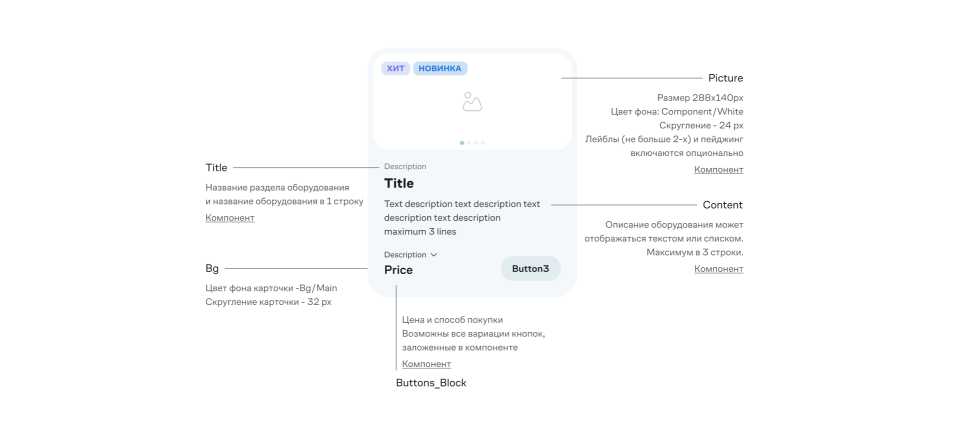 Component name — a specific and unique UI component name, to avoid miscommunication between designers and developers. This needed to be clear so that the components would work as they were supposed to without error.